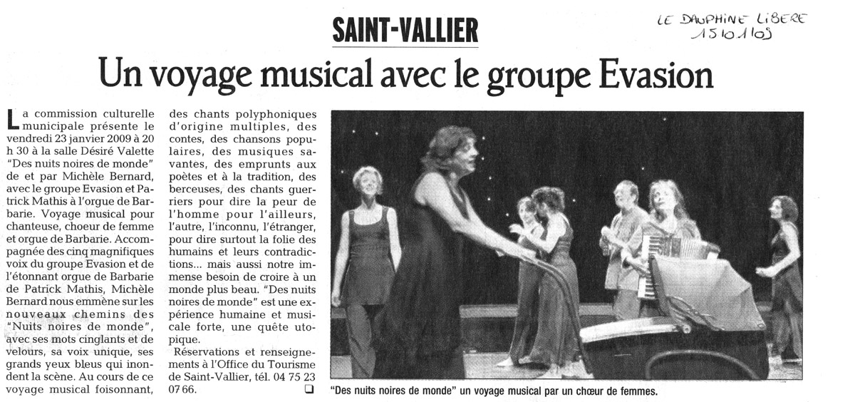 Ces « Nuits noires de monde » renaissent cet automne 2008, pour une nouvelle tournée au long cours, avec la chanteuse, Michèle Bernard, le chœur de femmes « Evasion » et le petit orchestre forain de Patrick Mathis et son orgue (de Barbarie).