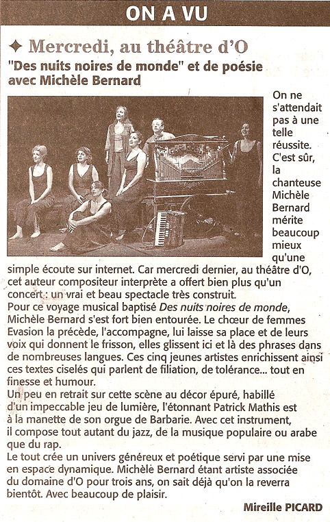Alors, en faisant un flash back panoramique sur les années passées, et les spectacles ayant marqué profondément par leur charge émotionnelle, par leur créativité, par leur faculté de générer du bonheur, il émerge quelques moments rares, en tout premier, « Des nuits noires de monde » créé en 1991 par Michèle Bernard, présenté en 1993 au Café de la Danse après une tournée de 2 ans. « Voyage musical pour chanteuse, chœur de femmes et petit orchestre forain » dans lequel quelques musiciens de jazz de l’ARFI donnaient un relief sonore d’une richesse et d’une subtilité inouïes. Il y avait une clarinette basse dont on retrouve les sons dans pas mal d’albums depuis. Et le formidable Patrick Mathis dont l’orgue de Barbarie voltige dans des rythmes qui sont loin de son répertoire habituel.